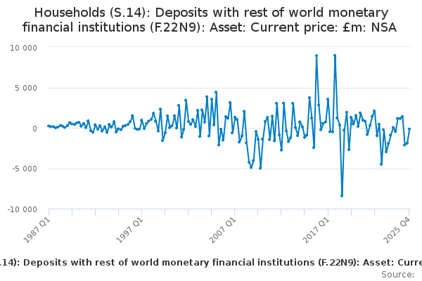 Download this time seriesHouseholds (S.14): Deposits with rest of world monetary financial institutions (F.22N9): Asset: Current price: £m: NSA