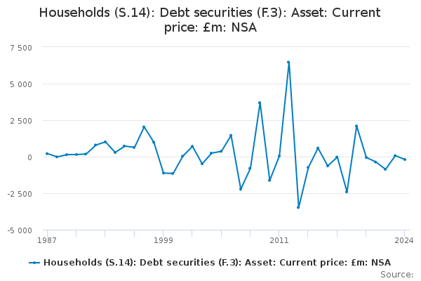 Download this time seriesHouseholds (S.14): Debt securities (F.3): Asset: Current price: £m: NSA