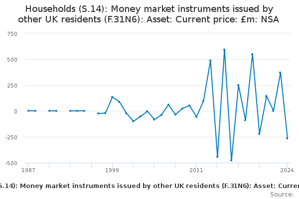 Download this time seriesHouseholds (S.14): Money market instruments issued by other UK residents (F.31N6): Asset: Current price: £m: NSA