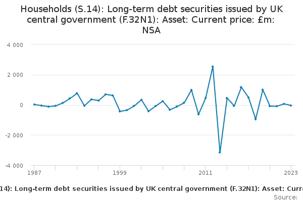 Download this time seriesHouseholds (S.14): Long-term debt securities issued by UK central government (F.32N1): Asset: Current price: £m: NSA