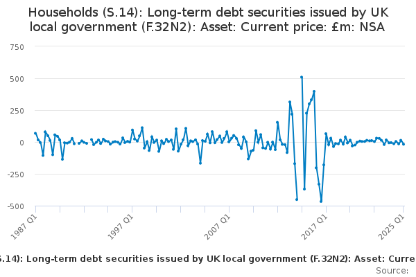 Download this time seriesHouseholds (S.14): Long-term debt securities issued by UK local government (F.32N2): Asset: Current price: £m: NSA