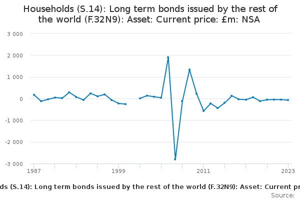 Download this time seriesHouseholds (S.14): Long term bonds issued by the rest of the world (F.32N9): Asset: Current price: £m: NSA