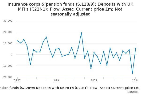 Download this time seriesInsurance corps & pension funds (S.128/9): Deposits with UK MFI's (F.22N1): Flow: Asset: Current price £m: Not seasonally adjusted