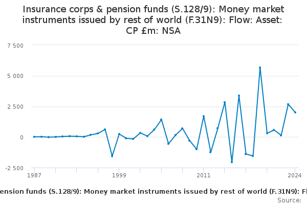 Download this time seriesInsurance corps & pension funds (S.128/9): Money market instruments issued by rest of world (F.31N9): Flow: Asset: CP £m: NSA