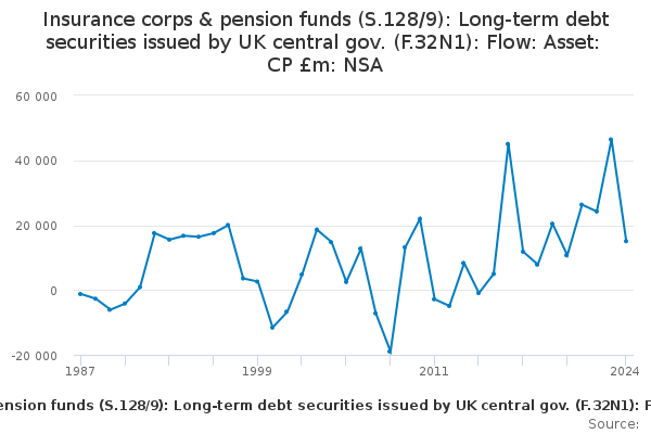 Download this time seriesInsurance corps & pension funds (S.128/9): Long-term debt securities issued by UK central gov. (F.32N1): Flow: Asset: CP £m: NSA