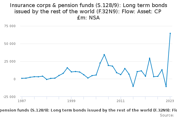 Download this time seriesInsurance corps & pension funds (S.128/9): Long term bonds issued by the rest of the world (F.32N9): Flow: Asset: CP £m: NSA