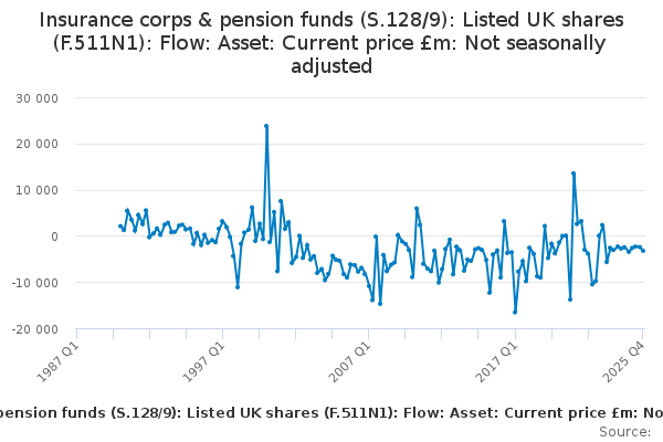 Download this time seriesInsurance corps & pension funds (S.128/9): Listed UK shares (F.511N1): Flow: Asset: Current price £m: Not seasonally adjusted