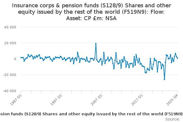 Download this time seriesInsurance corps & pension funds (S128/9) Shares and other equity issued by the rest of the world (F519N9): Flow: Asset: CP £m: NSA