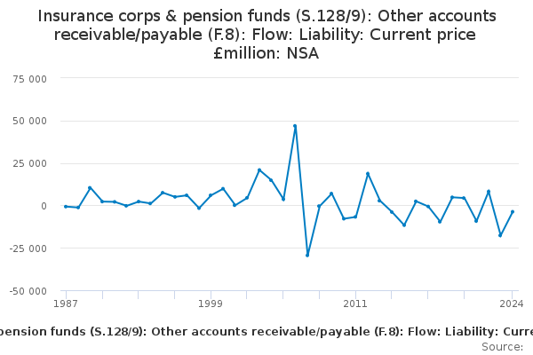 Download this time seriesInsurance corps & pension funds (S.128/9): Other accounts receivable/payable (F.8): Flow: Liability: Current price £million: NSA