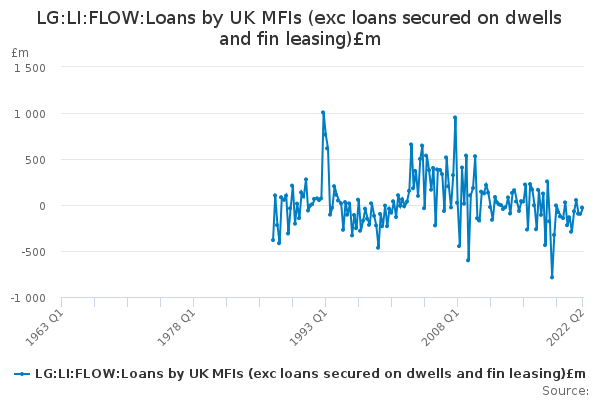 Download this time seriesLG:LI:FLOW:Loans by UK MFIs (exc loans secured on dwells and fin leasing)£m