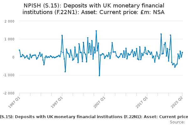 Download this time seriesNPISH (S.15): Deposits with UK monetary financial institutions (F.22N1): Asset: Current price: £m: NSA