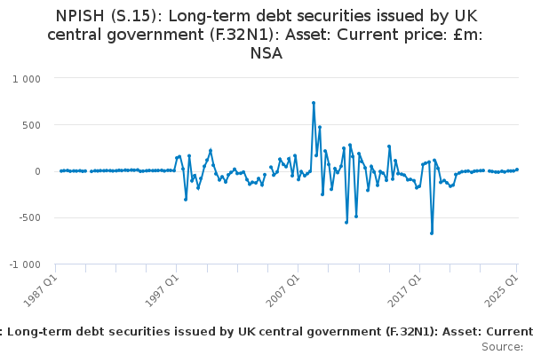 Download this time seriesNPISH (S.15): Long-term debt securities issued by UK central government (F.32N1): Asset: Current price: £m: NSA