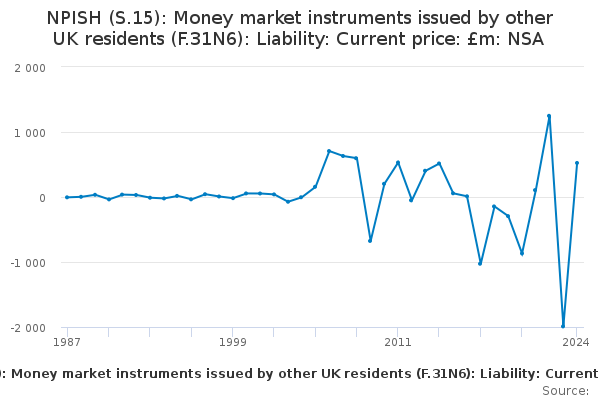 Download this time seriesNPISH (S.15): Money market instruments issued by other UK residents (F.31N6): Liability: Current price: £m: NSA