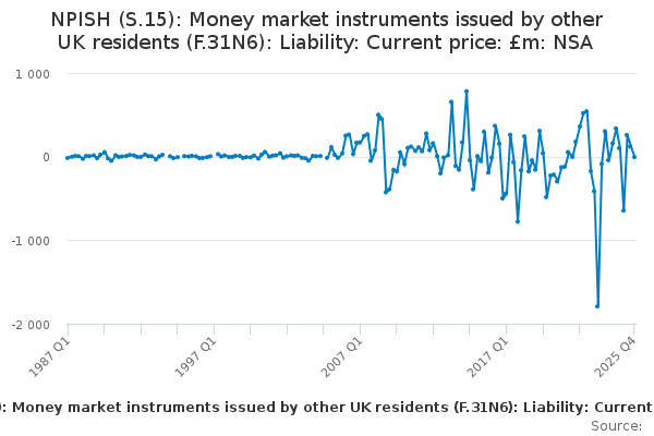Download this time seriesNPISH (S.15): Money market instruments issued by other UK residents (F.31N6): Liability: Current price: £m: NSA