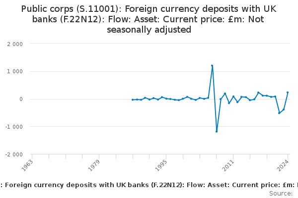 Download this time seriesPublic corps (S.11001): Foreign currency deposits with UK banks (F.22N12): Flow: Asset: Current price: £m: Not seasonally adjusted