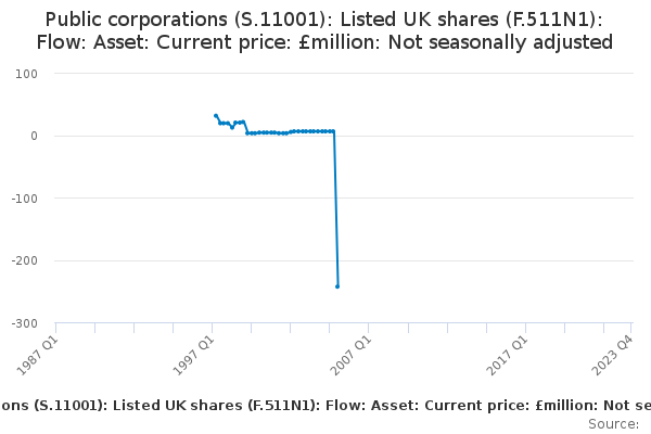 Download this time seriesPublic corporations (S.11001): Listed UK shares (F.511N1): Flow: Asset: Current price: £million: Not seasonally adjusted