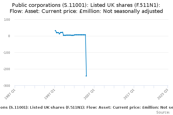 Download this time seriesPublic corporations (S.11001): Listed UK shares (F.511N1): Flow: Asset: Current price: £million: Not seasonally adjusted