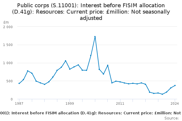Download this time seriesPublic corps (S.11001): Interest before FISIM allocation (D.41g): Resources: Current price: £million: Not seasonally adjusted