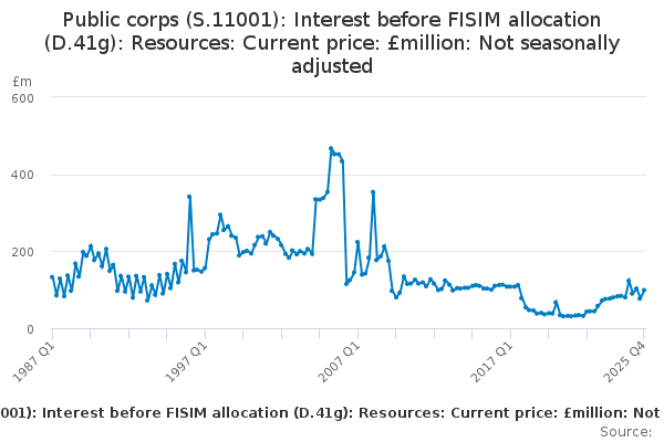 Download this time seriesPublic corps (S.11001): Interest before FISIM allocation (D.41g): Resources: Current price: £million: Not seasonally adjusted