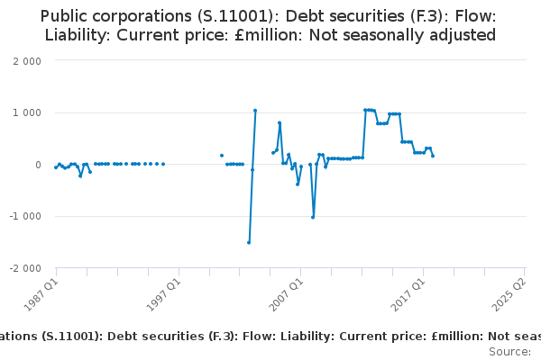 Download this time seriesPublic corporations (S.11001): Debt securities (F.3): Flow: Liability: Current price: £million: Not seasonally adjusted