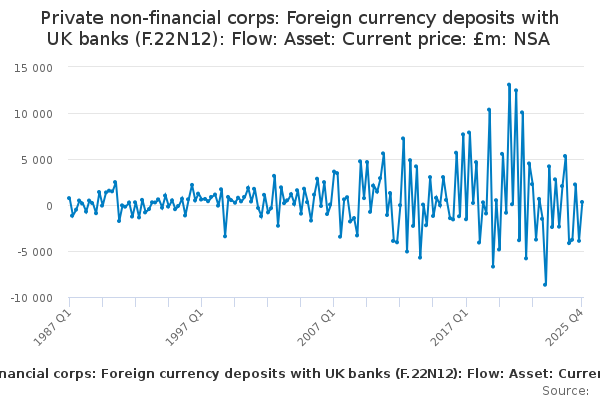 Download this time seriesPrivate non-financial corps: Foreign currency deposits with UK banks (F.22N12): Flow: Asset: Current price: £m: NSA