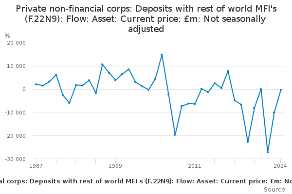 Download this time seriesPrivate non-financial corps: Deposits with rest of world MFI's (F.22N9): Flow: Asset: Current price: £m: Not seasonally adjusted