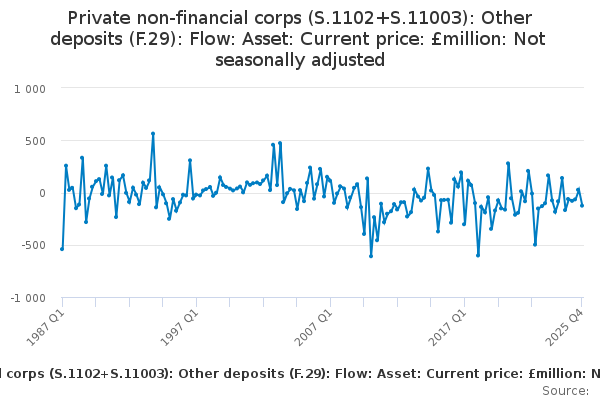 Download this time seriesPrivate non-financial corps (S.1102+S.11003): Other deposits (F.29): Flow: Asset: Current price: £million: Not seasonally adjusted