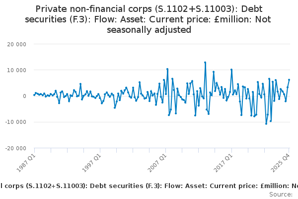 Download this time seriesPrivate non-financial corps (S.1102+S.11003): Debt securities (F.3): Flow: Asset: Current price: £million: Not seasonally adjusted