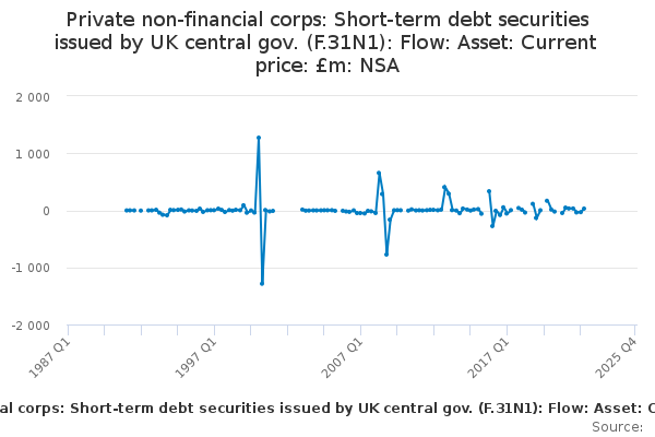 Download this time seriesPrivate non-financial corps: Short-term debt securities issued by UK central gov. (F.31N1): Flow: Asset: Current price: £m: NSA