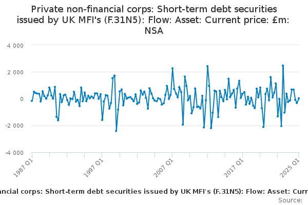 Download this time seriesPrivate non-financial corps: Short-term debt securities issued by UK MFI's (F.31N5): Flow: Asset: Current price: £m: NSA