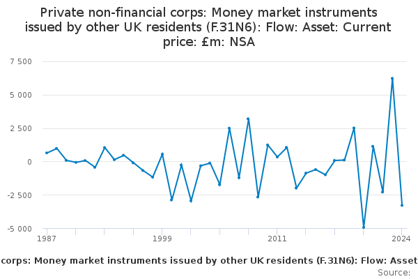 Download this time seriesPrivate non-financial corps: Money market instruments issued by other UK residents (F.31N6): Flow: Asset: Current price: £m: NSA