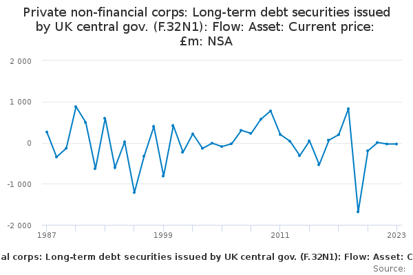 Download this time seriesPrivate non-financial corps: Long-term debt securities issued by UK central gov. (F.32N1): Flow: Asset: Current price: £m: NSA