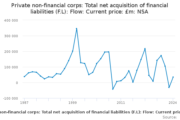 Download this time seriesPrivate non-financial corps: Total net acquisition of financial liabilities (F.L): Flow: Current price: £m: NSA