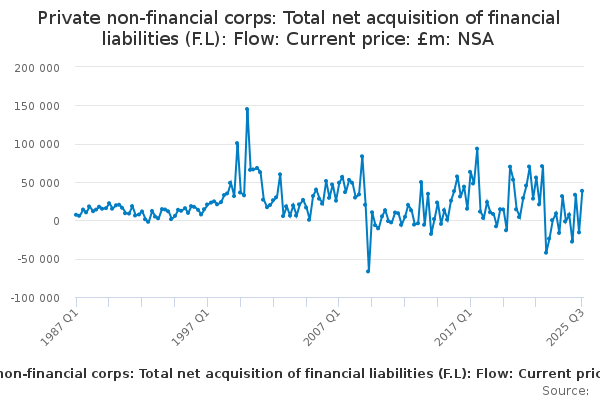 Download this time seriesPrivate non-financial corps: Total net acquisition of financial liabilities (F.L): Flow: Current price: £m: NSA