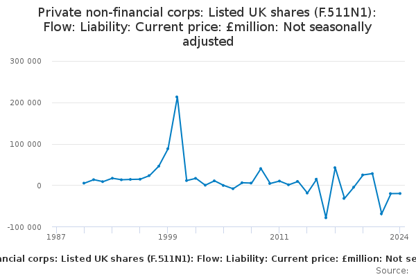 Download this time seriesPrivate non-financial corps: Listed UK shares (F.511N1): Flow: Liability: Current price: £million: Not seasonally adjusted