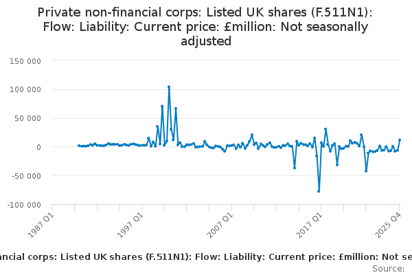 Download this time seriesPrivate non-financial corps: Listed UK shares (F.511N1): Flow: Liability: Current price: £million: Not seasonally adjusted