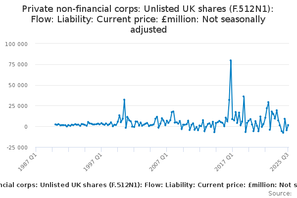 Download this time seriesPrivate non-financial corps: Unlisted UK shares (F.512N1): Flow: Liability: Current price: £million: Not seasonally adjusted