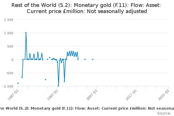Download this time seriesRest of the World (S.2): Monetary gold (F.11): Flow: Asset: Current price £million: Not seasonally adjusted