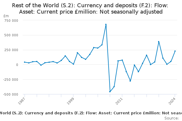 Download this time seriesRest of the World (S.2): Currency and deposits (F.2): Flow: Asset: Current price £million: Not seasonally adjusted