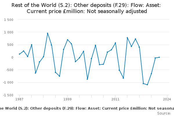 Download this time seriesRest of the World (S.2): Other deposits (F.29): Flow: Asset: Current price £million: Not seasonally adjusted