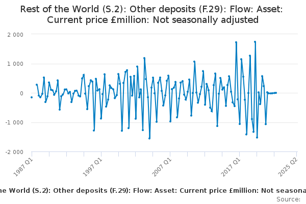 Download this time seriesRest of the World (S.2): Other deposits (F.29): Flow: Asset: Current price £million: Not seasonally adjusted