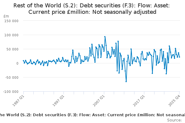 Download this time seriesRest of the World (S.2): Debt securities (F.3): Flow: Asset: Current price £million: Not seasonally adjusted