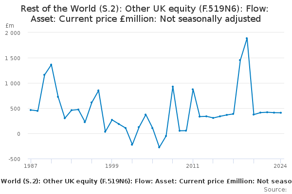 Download this time seriesRest of the World (S.2): Other UK equity (F.519N6): Flow: Asset: Current price £million: Not seasonally adjusted