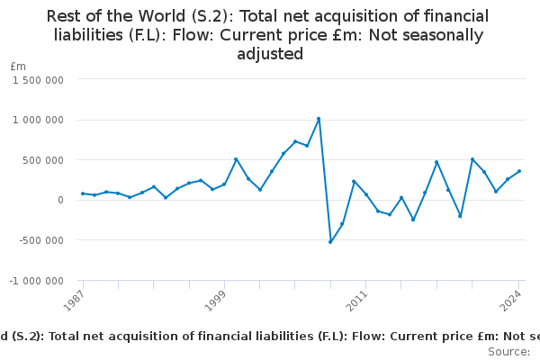 Download this time seriesRest of the World (S.2): Total net acquisition of financial liabilities (F.L): Flow: Current price £m: Not seasonally adjusted