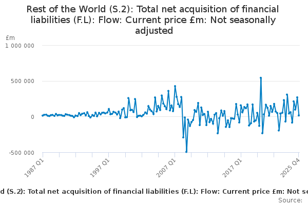 Download this time seriesRest of the World (S.2): Total net acquisition of financial liabilities (F.L): Flow: Current price £m: Not seasonally adjusted