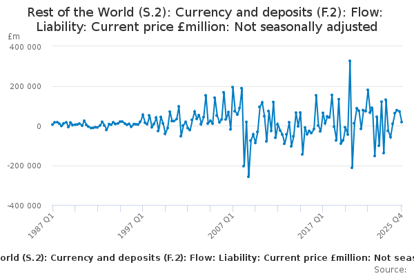 Download this time seriesRest of the World (S.2): Currency and deposits (F.2): Flow: Liability: Current price £million: Not seasonally adjusted