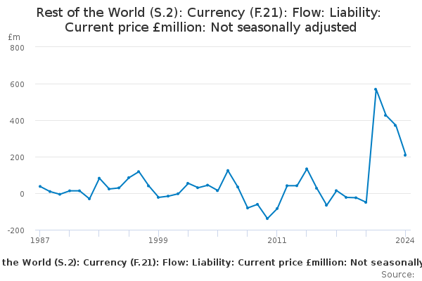 Download this time seriesRest of the World (S.2): Currency (F.21): Flow: Liability: Current price £million: Not seasonally adjusted