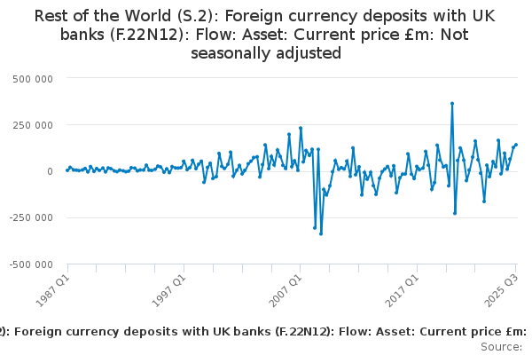 Download this time seriesRest of the World (S.2): Foreign currency deposits with UK banks (F.22N12): Flow: Asset: Current price £m: Not seasonally adjusted