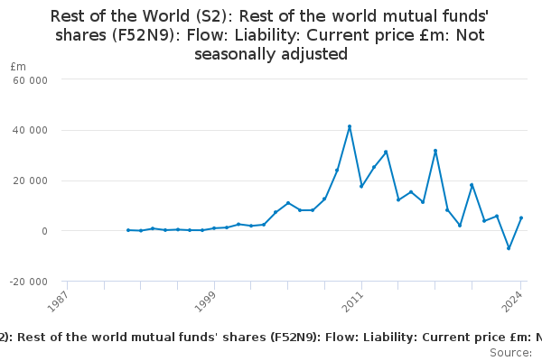 Download this time seriesRest of the World (S2): Rest of the world mutual funds' shares (F52N9): Flow: Liability: Current price £m: Not seasonally adjusted