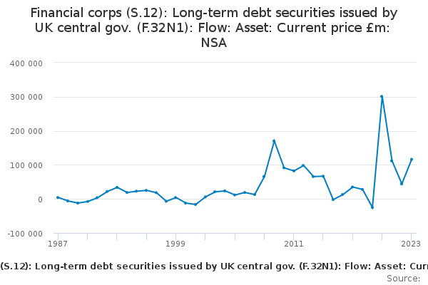 Download this time seriesFinancial corps (S.12): Long-term debt securities issued by UK central gov. (F.32N1): Flow: Asset: Current price £m: NSA
